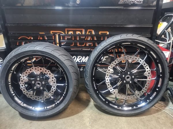 Equipped with dual-disc high-performance brake rotors, Arlen Ness wheels not only look stunning but also provide superior stopping power. Common sizes include 21, 23, and 26 inches, ideal for custom bagger styling. Some sets, like the Heathens for Heath, even come wrapped in Avon Cobra chrome tires with 15” oversize front brakes and matching rear brakes, available for around $1000 shipped.