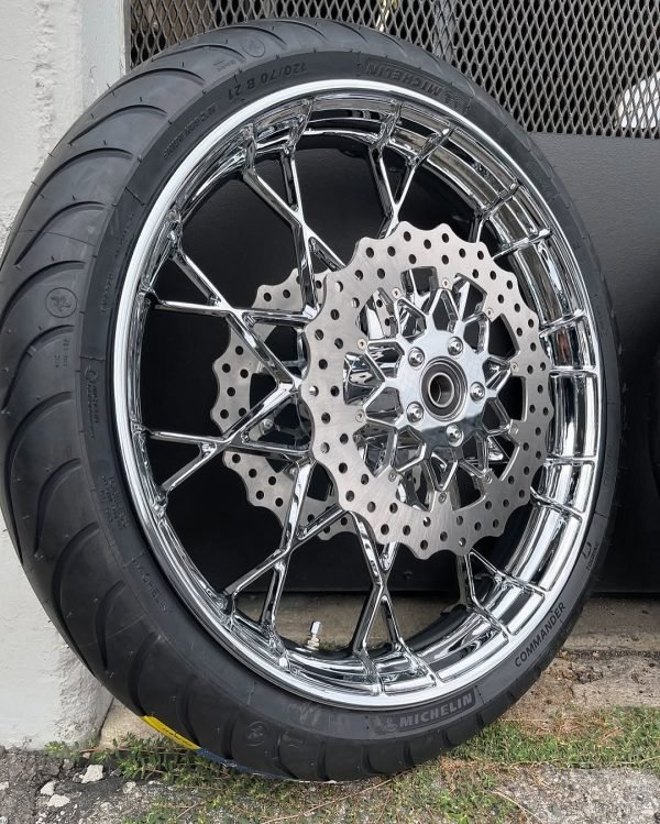 A: Our popular options include 21” front and 18” rear Chrome wheels, ideal for Harley motorcycles.